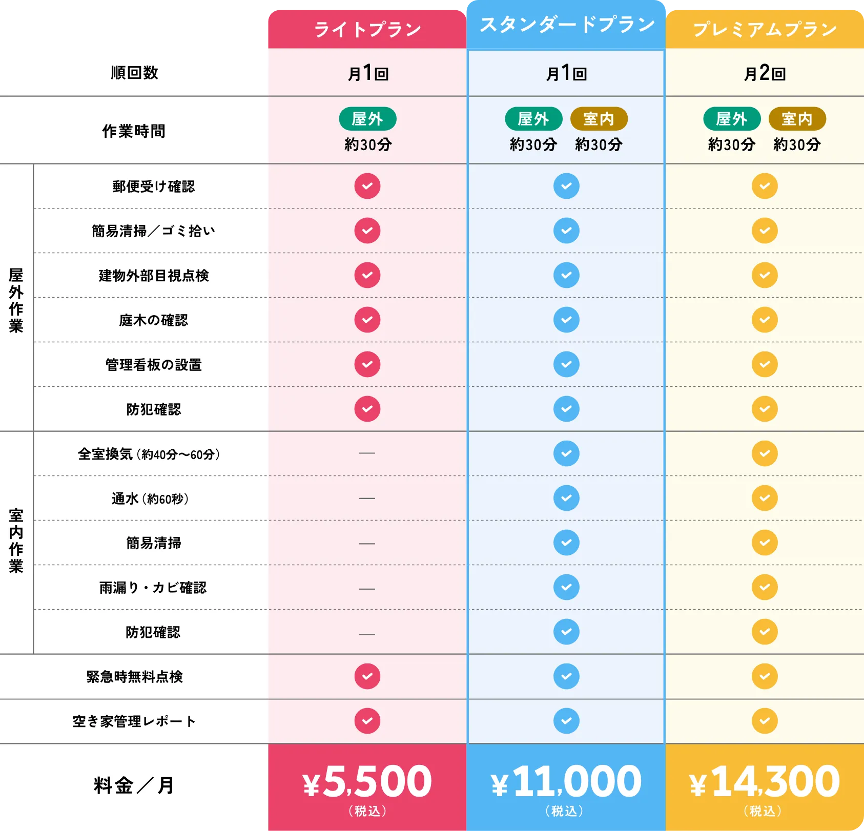 年間契約による月に1度の巡回管理業務となりますので、管理を希望しない月がございましたら事前にご連絡ください。また、管理不要の月があった場合においても月々の管理費用は免除とはなりませんのでご承知おきください。